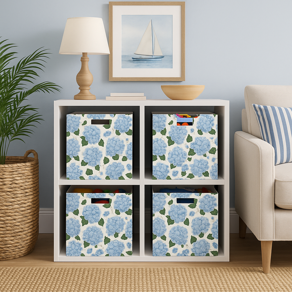 This set of 4 collapsible felt bins is where coastal charm meets everyday function. Featuring our signature blue hydrangea print, these lightweight storage boxes (14.5″ x 13″) are the perfect blend of beauty and practicality. Whether you’re tidying up toys, throws, or everyday essentials, each bin adds a fresh pop of floral style to shelves, closets, and playrooms alike.