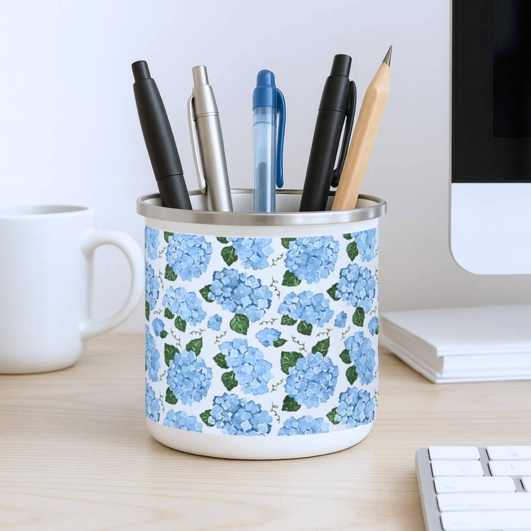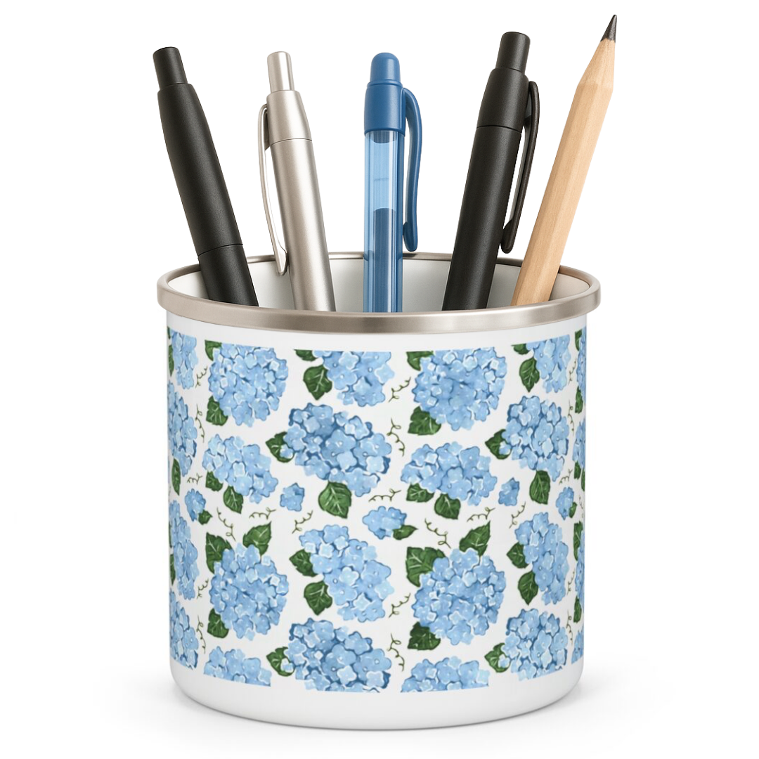 Brighten up your desk with a pop of hydrangea charm! This enamel pen holder is durable, lightweight, and wrapped in our signature watercolor design. Perfect for keeping pens, pencils, and creative tools organized while adding a touch of coastal style to your workspace.