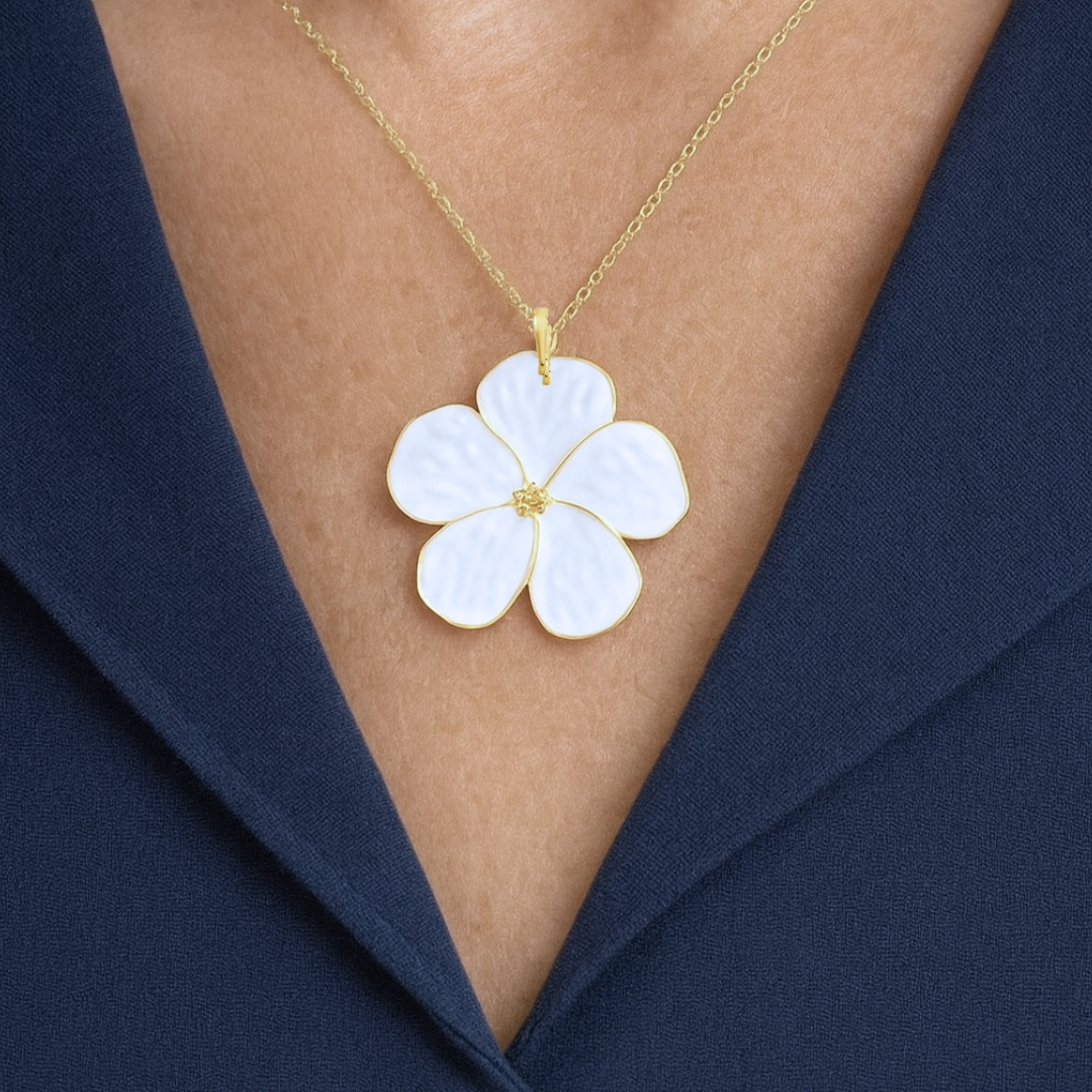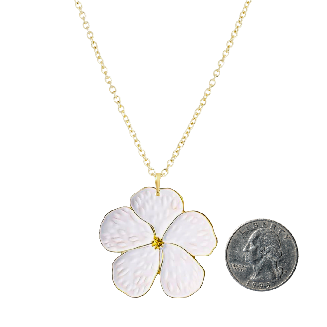 Inspired by New England’s favorite bloom, the White Hydrangea Charm Necklace is a fresh take on classic coastal style. The hand-enameled charm measures 1.8″ x 1.8″, featuring soft white petals edged in radiant gold plating with a dotted gold center. It hangs from an 18″ gold-plated chain — the perfect length for layering or making a statement on its own.